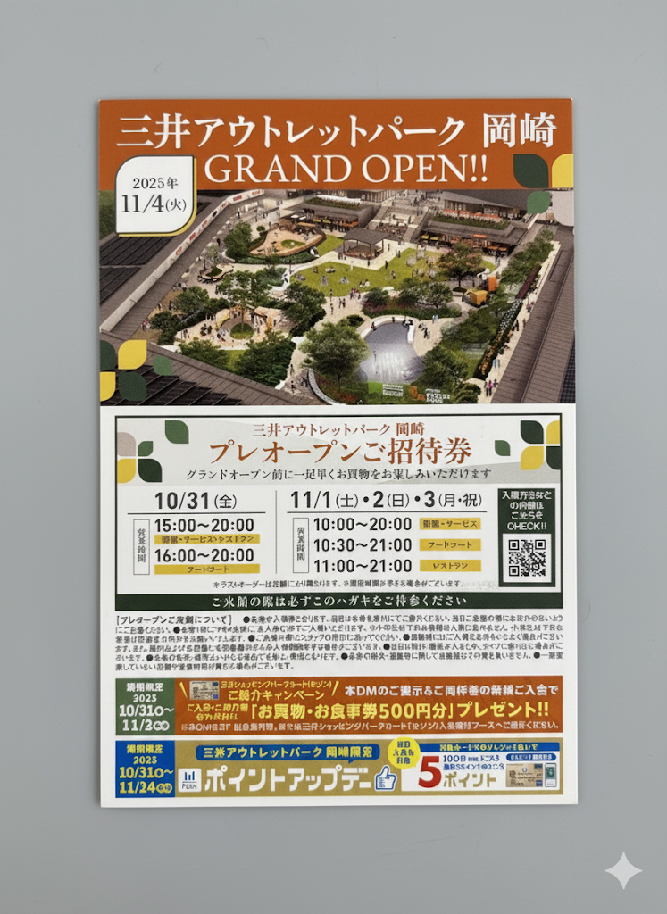 いよいよ待望の「三井アウトレットパーク 岡崎」がグランドオープン(2025年11月4日(火))を控え、プレオープンへの参加チャンスをいただきました!招待ハガキを手にして、期待が爆発しそうなので、プレオープン前にわかっている情報を全部まとめて、興奮をそのまま読者の皆さんに届けます。